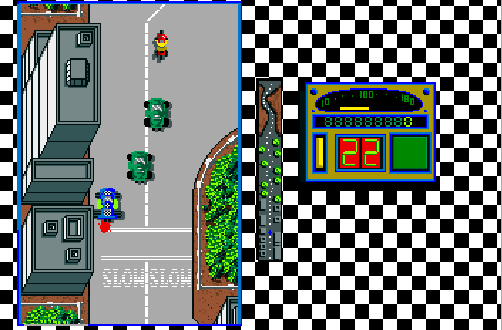 An OCS amiga can display 32 colours simultaneously in low-res mode, without any special tricks like half-bright or HAM! What do you think it is, an Atari ST?  By the way, the game-that-isn't-supersprint that you are all wondering about is 'Indy Heat'.