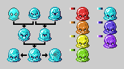 Went back to working on the slime sprite:   In the chart to the left, the top left was my original version, top center is an edit from the pixel work thread, top rightis a different, one-eyed version using the same color pallette as the edit. Then the middle two are mish mashes of the two above them, then the bottom center is a mishmash of the middle two, with two possible variations. I'm seriously considering using the bottom right one, but the transparency effect (the grey blob in the middle of it is supposed to be some internal organ or cell nucleus or something) doesn't look quite right. Then on the right are possible pallette swaps.