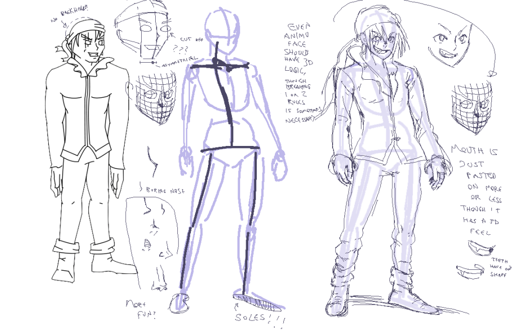 Is miles better than what you first posted I did an edit/remake of your first art in this thread.  I wanna emphasize geometric construction, make boxes/cylinders/blobs and think in 3D! PRACTISE thinking in 3D lots! Think of swooshy lines when you attempt to get a character down on paper/the screen, and get stuff out there swiftly so you can worry about making stuff work along the way. I also doodled a lot of poo about how being able to draw faces with a distinct 3d feel helps any kind of stylized face, but I'll just leave this here and see if you have any questions.