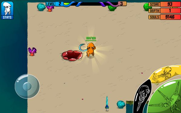 HUPDAAAATE! We've got the bare bones of the story implemented, complete with a pet (!) and a BFF, conveniently named Biff. The story begins with you and Biff and his pet starfish, Bingo, playing some underwater tennis on the reef. After a few cursors swings, you accidentally hit the ball over the ledge and, lo and behold, Bingo goes leaping after it, into the abyss. Biff swears a bundle and leaps down to find his dog, and you follow. You then journey with Biff as a companion until roughly depth 15, at which point Bingo is found and the two are united. SUDDENLY! Abyss creatures well up and steal Biff into the abyss. Now it's up to you and Bingo to save him.  Next week is the artifact system, which should add another shot of depth (Ha!) to the game system.