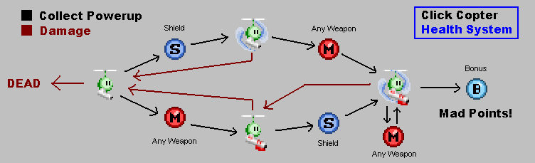 The health system works somewhat like Super Mario Bros. If you have no shield and the basic gun, it's one hit and your dead. However, you can only take damage from a wall if you fly into it with high velocity. If you hit a wall lightly, you will simply bounce off and be unable to fire your weapon for one second. At full power (with a weapon and a shield), you have three hits. The shield always comes off first when you take damage. The second time you take damage you lose your weapon and go back to the basic gun. If you take damage when you only have the basic weapon, your dead.  This means that its quite important to kill enemies to allow them to drop a weapon or a shield for protection. You can keep taking damage while grabbing a new shield and stay alive throughout the entire level. You should still try to dodge as best you can, since shields become bonuses with a base point value of +10. Therefore, less damage = higher scores.