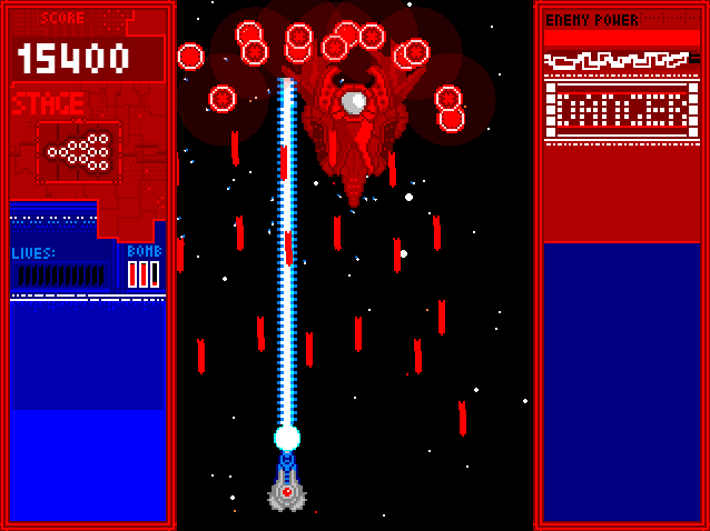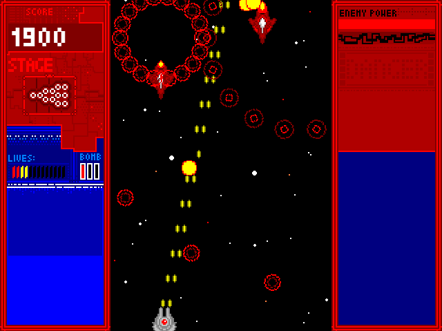 Current Demo Build 1.1: http://www.mediafire.com/download.php?v6u5lynnnrcl2a5[Last Update] Any feedback and bug reports are, as always, encouraged :DAnd here's the assembled look for Stage 3a.  Well, except that larger distracting pillar is going to take a trip to the background. The pink wall segments on either side can slide forth in various formations, it remains to be seen how we utilize that. [Last Update End] Year 20XX Earth is invaded by the dark enemy hordes In desperation all the worlds scientific power congregates to create the ultimate fighter The last hope of EarthSo yeah, me and PureQuestion collect our powers and liking of the shmup genre to create a fun spaceship adventure. The project is still young but now we have tons of crazy ideas for later to realize. Pure programs the game in Game Maker. I draw the graphics.