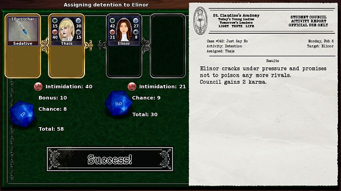 9 AM Monday morning. A report lands on your desk: Jeanette's monogrammed silver locket has gone missing. The last time she definitely remembers having it, she was walking in the Field with her friend Susan. Shifty hallmate Ashley had also been admiring the locket recently.Imagine an RPG where instead of fighting monsters, you're fighting scandals. You're in charge of the Student Council of an elite all-girls boarding school, and you must send your minions to investigate crimes and protect your reputation by any means necessary.Going to search the Field for Jeanette's locket? You'd better assign a minion with good Observation skills.  Think that Ashley might be hiding it somewhere? Maybe you can assign someone good at Stealth to tail her.  Want to scare information out of Susan? Send in someone with a good skill in Intimidation.  Your minions each have their own skillset, which you can level up as you solve cases. You assign minions to tasks, along with bonus equipment to boost their stats. Then you compare those stats to the target, along with the luck of the magical d20:  The cases themselves are randomly generated per-playthrough, so you must rely on the skills of your minions in order to find the clues to proceed. Unfortunately, one of them is secretly a traitor... and that's where the real plot of the game comes in. You can interact with your minions in either a friendly or romantic way to build their loyalty and find out about the big conspiracies behind all of these little crimes. So, to sum up: Lesbian schoolgirl noir secret police investigation RPG.Game website with demos (PC / Mac / Linux) and trailer