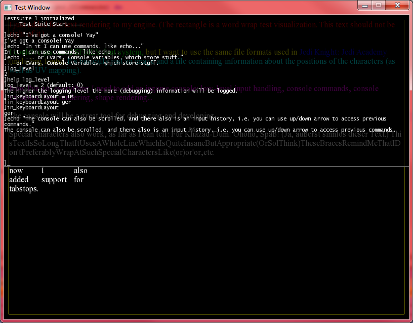 Nice idea! Well, first I'll need to get the basic game up and running, and I've got less than 4 weeks left... Well, I plan to finish this anyway, even if I don't make it in time. Haven't done much recently, fixed some font-related problems and added tab support. I edited the shot above to reflect that. --edit-- I've started work on the console and wrote a word wrap algorithm, see the now updated screenshot above.