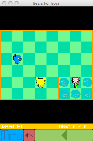 A Chu-Chu Rocket-esque game I'm working on, where the goal is to get the gummi bears to mix together and get to the appropiate color boy. As you can see from the photo below from the prototype, I had intended to be called "Bears For Boys", however a quick search on google and some comments from friends has me scrambling for a new name. So far, my top ideas for replacements are "Hello, Mr.Bear" & "Go! Mix! Match Color!"Y like more the "Go! Mix! Match Color!" title. Match with the game's idea.