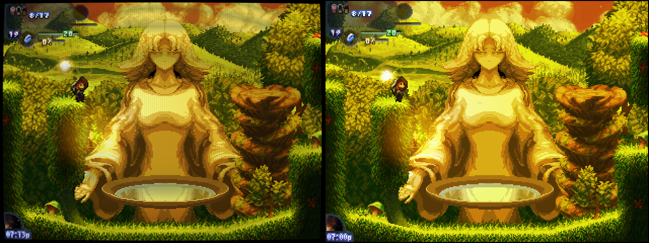Added an unlockable CRT screen mode a few months ago for the ones that like scanlines; you can turn it on in the options screen and play the whole game like that if you want to. The picture itself is of one of the save statues.  That color palette is incredible. Mmm I want that. Gorgeous.