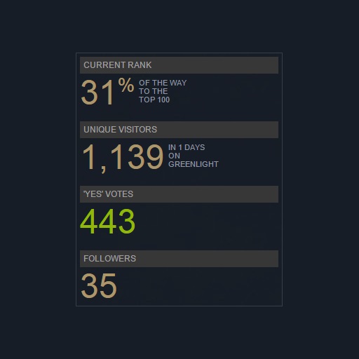 Absolute rollercoaster of emotions in the last 24 hours. After one day, Remnant is 31% of the way up the ladder to top 100 on Greenlight:  I have absolutely no clue how good that is as there's little baseline to compare it to. It feels good though, so who cares! If any Greenlight experienced devs want to chime in, please do. The Kickstarter is slowly trickling in backers. I haven't had much luck with getting coverage on any sites, sent about 100+ e-mails last night and this morning, but fingers are still crossed. If anyone knows a guy who knows a guy who knows a guy, that would be very welcome right now.
