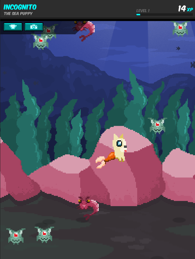 Hi! I'm currently working on a pet simulation game, similar to tamagotchi, but with choose-your-own-adventure aspects. You take care of mermaid/canine sea creatures called Sea Puppies. It's meant to be a mobile game for the iOS and Android, but I figured it's easier to play the alpha build via the browser. Currently, I'm looking for feedback on the gameplay and art style. The gameplay is very simple, you just click on a Cat Plankton or Cat Krill to feed your Sea Puppy. When your puppy eats enough food, it will go on an adventure! You will be given some options, and your puppy will grow depending on what choices you make. Once they're old enough, your puppy will leave you to find their place in the world as an adult. It's still early alpha, but I'm planning on adding an upgrade store where you can unlock larger food types like Cat Squids and Cat Shrimps, and a collection screen so you can see all the endings you have unlocked. For art style, I think the sprites look okay when they're static, but once they animate, I'm not quite sure why it looks... odd. Might be just me since I've been working with them day in and out. If you have any suggestions, I'd be happy to hear it (please be gentle, lol). Alpha Web Buildhttp://adventurecat.us/seap/alpha.htmlScreenshots