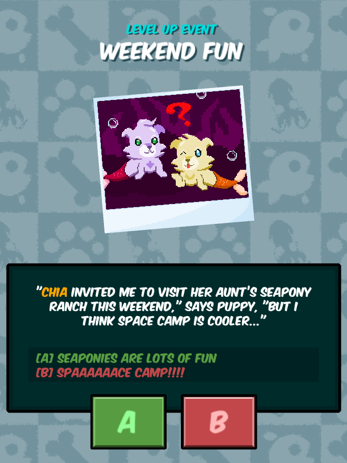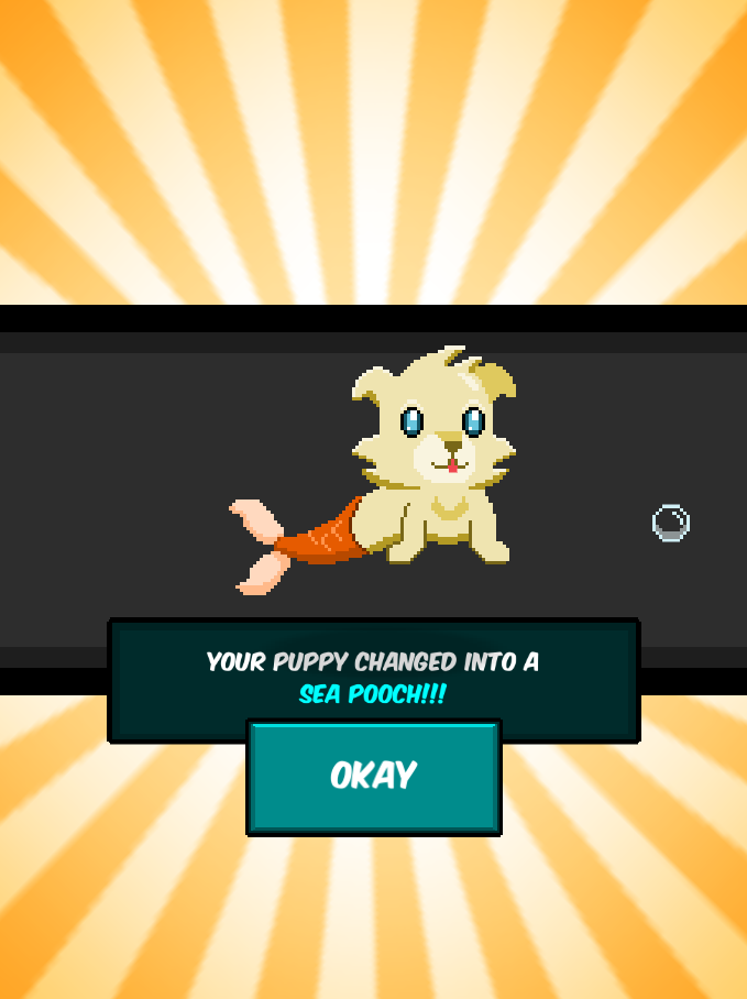 The GameSea Puppies is a pet simulator (for lack of a better term), with lots of choose-your-own-adventure type aspects. You take care of adorable mermaid doggy sea creatures called Sea Puppies. You raise them, and feed them, and teach them lessons about life and what-not, so they become good sea citizens and contributing members of marine society. I really wanted it to be some kind of "parent simulator" to be quite honest, but I'm not sure if younger players would like that. Anyways~  More alpha footage: https://www.youtube.com/embed/pkv3xBYMwKoThe PuppiesAfter a comprehensive - but really short - personality quiz, you will be given your first egg to adopt that looks like the one below. Depending on your personality, you might get a more sociable, or a very shy, Sea Puppy breed. Right now, I'm planning on having six breeds in the first release.  In time, it will hatch into a Sea Puppy that look like these guys:  But Sea Puppies will get hungry, and you need to feed it in order to grow. Sea Puppies like to eat Kitty Planktons... and Kitty Krills... and Jellycats... and Cat Squids... and Neko Shrimps... and other cute-but-delectable feline-esque creatures of the sea. Here's a close-up of some Kitty Planktons:  As they mature, they will go out on different adventures, and seek your advice when they encounter life-changing events...  Or in dangerous situations...  Your Sea Puppy will grow depending on which choices you make. So for example, if you make poor choices, your puppy might not finish high school and run away... and end up working in a job he doesn't like, or even run off to join the army because your puppy has no friends and always felt out of place in school!  But if you did take very good care of your puppy, they might finish Sea Puppy College and even graduate with a major degree! Give them enough TLC and parental support, and who knows what your puppy can grow up to become!  And if you're lucky, they might even leave you with a little souvenir to remember them by - which future puppies can use as items that can help them in their many, many adventures! The PlatformThe current plan is to release it on mobile iOS and Android. I figured it would be easier to take care of your pet when it's on your phone/iPad. The TeamCurrently, the game is being developed by a single developer/artist - me - so production is slow, but hopefully it will come out some time this year (or not... idk... you know how indie games are). Until then, I'll keep coding my life away.