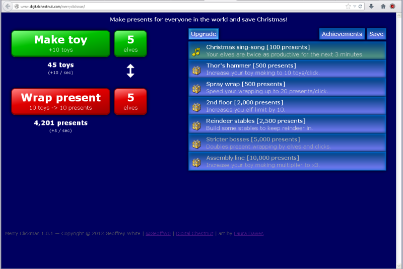 I've just released a free browser game along the lines of Cookie Clicker, Candy Box and Clicking Bad. This was a fun little project to brush up on my Javascript / HTML / CSS skills. Here it is: Merry Clickmas Have fun!