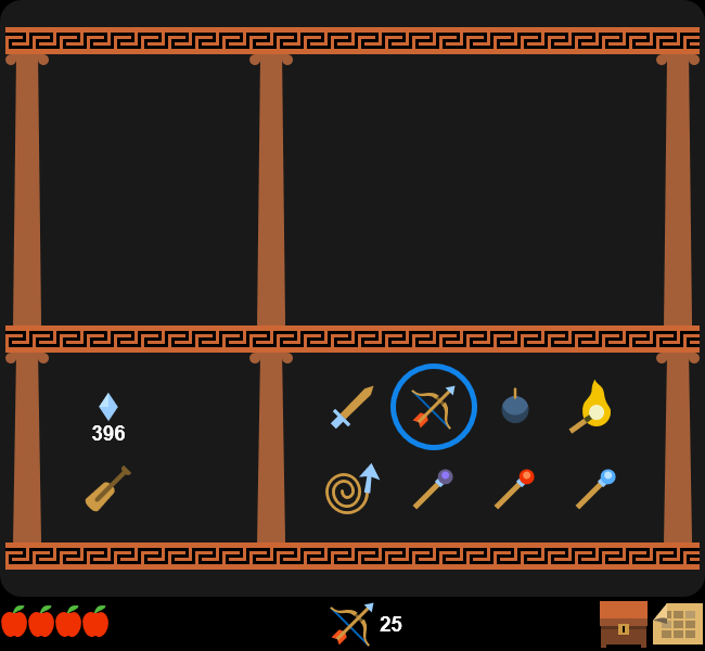 Did some work recently to art up the various UI screens/menus. Inventory screen -- shows all weapons and treasures you've collected  Map screen -- shows unvisited rooms, visited rooms, and current room  Quick switch menu for weapons -- hold space and click with a mouse, then release space. Inspired by radial menus like skyward sword, and Maya