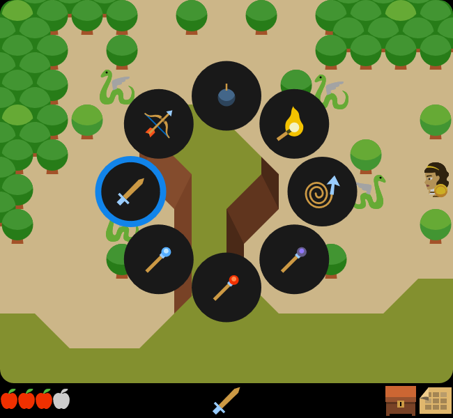 Health Meter IterationI wanted to replace the heart meter with something else, since I'm a clone, but not a shameless one. I had various ideas like plain circles, flowers, and apples. So i just made a bunch of attempts --  I actually feel the circles were pretty nice from a minimalist standpoint. If it was only a health meter, i might go with that. However, the same icons need to be usable as pickups in the world to refill health, and pickups that extend your max health. Circles would not be clear enough in those other contexts. As for flowers, I didn't like any of my attempts. Finally I got going on the apples. It took me a while to try different combinations of stem, leaf, shadow, etc. I think stem + leaf is too detailed. Stem alone looks like a cherry. Leaf alone works. Then i needed to figure out which elements of the silhouette were necessary to look like an apple. A key lesson is the top curve needs a dip in the middle. BUT THEN....  WTF. So it turns out that photoshop and HTML5 canvas don't rasterize bezier paths the same. This is the first piece of art where I was picky enough about small details to notice (since I'd been tweaking the same paths for a while.) You can see above i mirrored them so you can compare them closer. I spent a lot of time making sure that it wasn't a problem with my import tool. It isn't. I have not solved this, but i basically tweaked the photoshop file so that it looks wrong, but correct in game. In the long run I guess I need to write a native javascript path editor, or just learn to not care so much about individual pixels. Anyway, here is the new health meter, along with improved forest tiles (some trees are lighter for variety), snakes with wings (so they look more mythological), and other art tweaks.