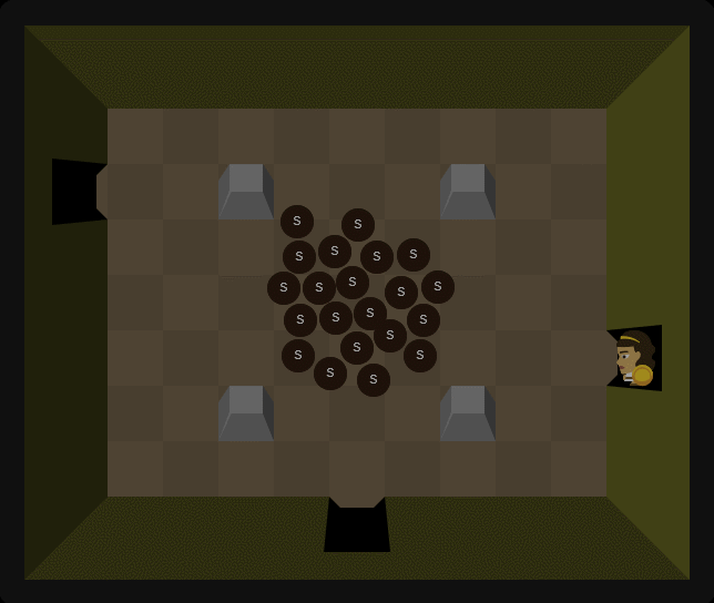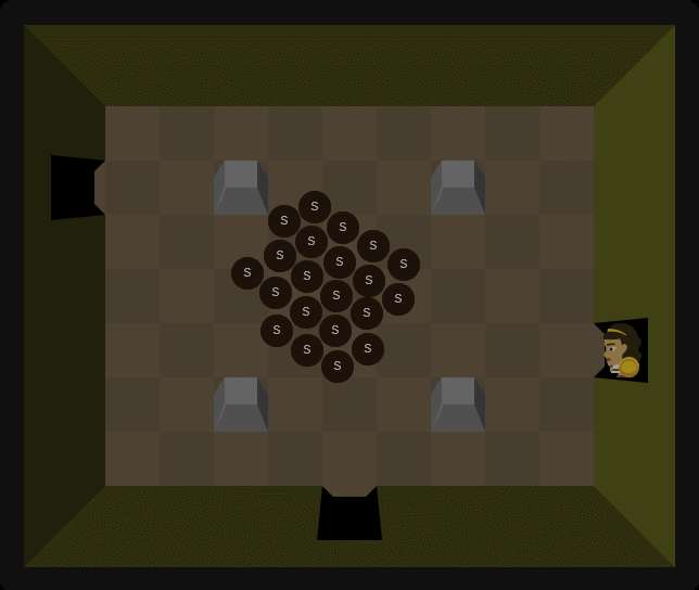 Latest progress:I have recently felt stalled a bit when making new enemies/objects because I get hung up on what the art should look like. I realized this was slowing me down so I resolved to rapid prototype a bunch of new ideas without worrying about art until after the gameplay is fun -- this also means I'm free to cut the enemy without guilt if I realize it was a bad idea. Part of proving that it's fun is seeing if I can make enough interesting rooms that incorporate the enemy/object in novel ways. So by having a functional prototype i can actually play with different room ideas in the level editor and see if they work for real, not just in my imagination. I'm just using a simple colored square or circle with a letter or symbol to indicate the object type. I set it up so i just need two lines of code to do that.  Here's one of the new enemies below, the "Swarm" (placeholder name) which uses flocking behavior to move as a living mass and chase down the player once they see her. There are various ways to deal with them, including using bombs to take out a bunch at a time, and using a torch to keep them at bay:    Finally a funny story -- I was really worried that my code was super unoptimized because with flocking turned off, the game ran 3.5ms faster than with flocking enabled. This is just for 20 enemies doing the routine. That meant that almost 40% of my frame was spent on flocking logic, which is really just some for loops with vector operations inside! Finally i realized the real problem -- the flocking code rotated the sprite, which is unrotated by default. The sprite included text -- and apparently canvas text rendering is much slower when rotated! So just by leaving the sprite at default rotation, the perfomance problem went away. This won't be an issue with my final vector art so I don't really need to worry about it. Though it's a good lesson to use native text sparingly in my game, and never rotate it.