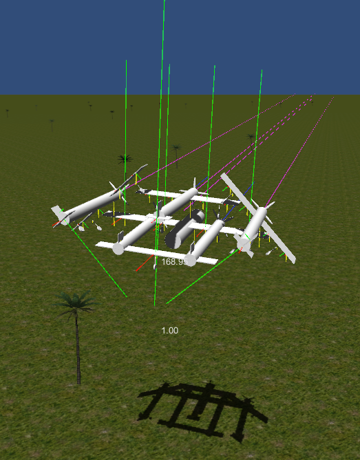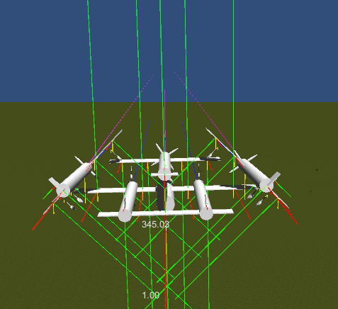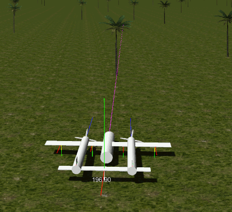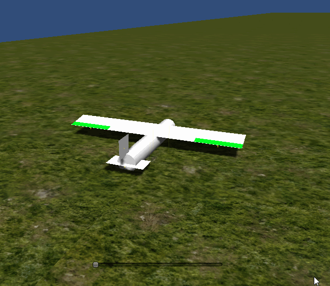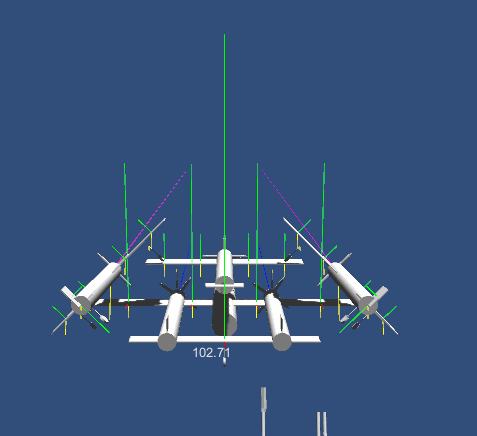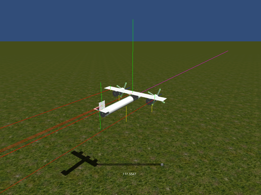 This plane is defined by a fuselage, a propeller, 6 wing components, and 3 landing gear components. Each component has a mass property. The fuselage is nothing more than a mass. The propeller has a thrust, which you can see by the blue line extending from it. Each wing has lift and drag; lift is the green line and drag is the red line. The magenta line is the overall velocity of the plane. Wings can also have ailerons which when activated can increase or decrease the overall lift provided. In this example the far left and far right wings have ailerons, as well as the two parts of the tail. The rudder is just a vertical wing with an aileron. By manipulating these ailerons you can control yaw, pitch and roll.