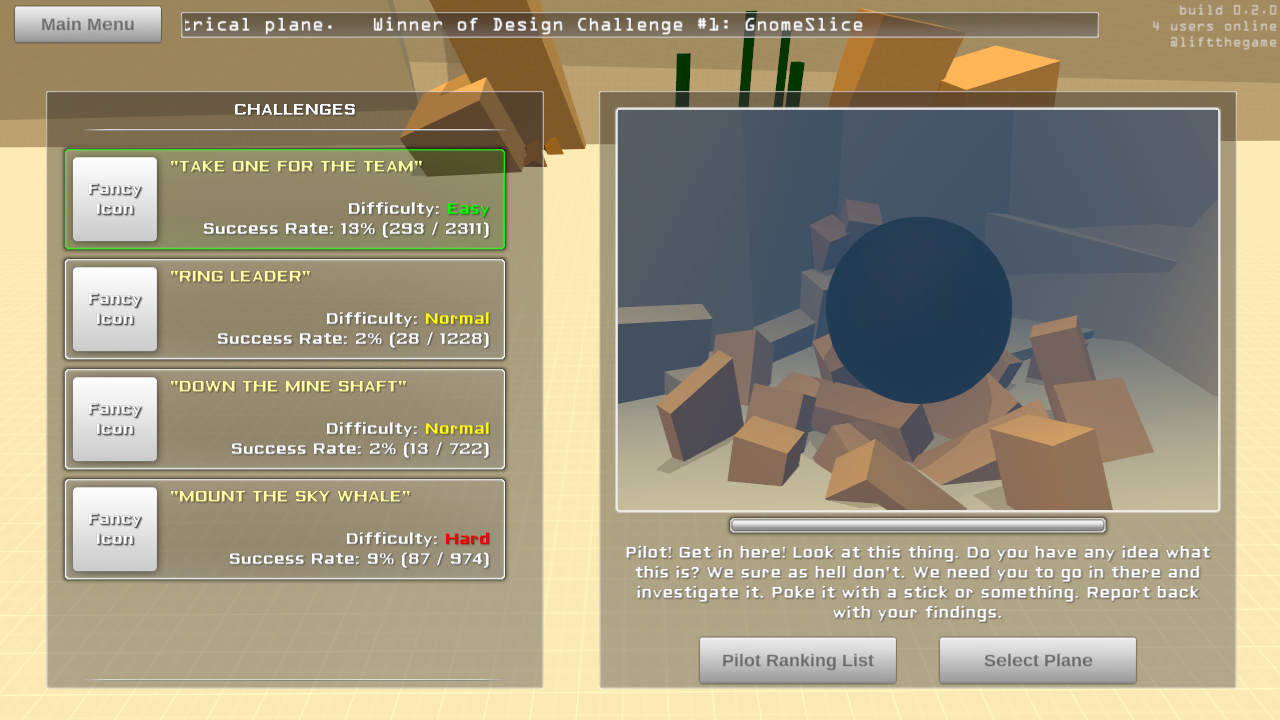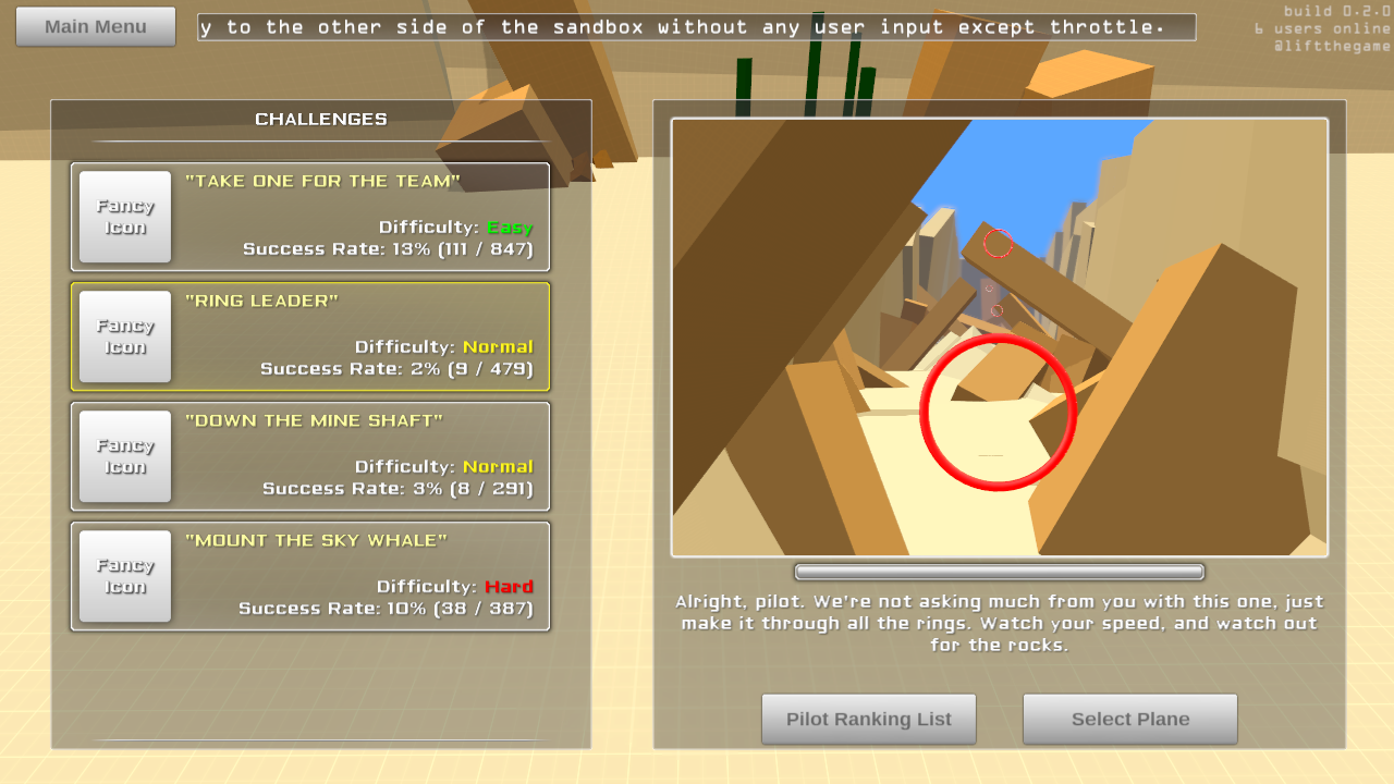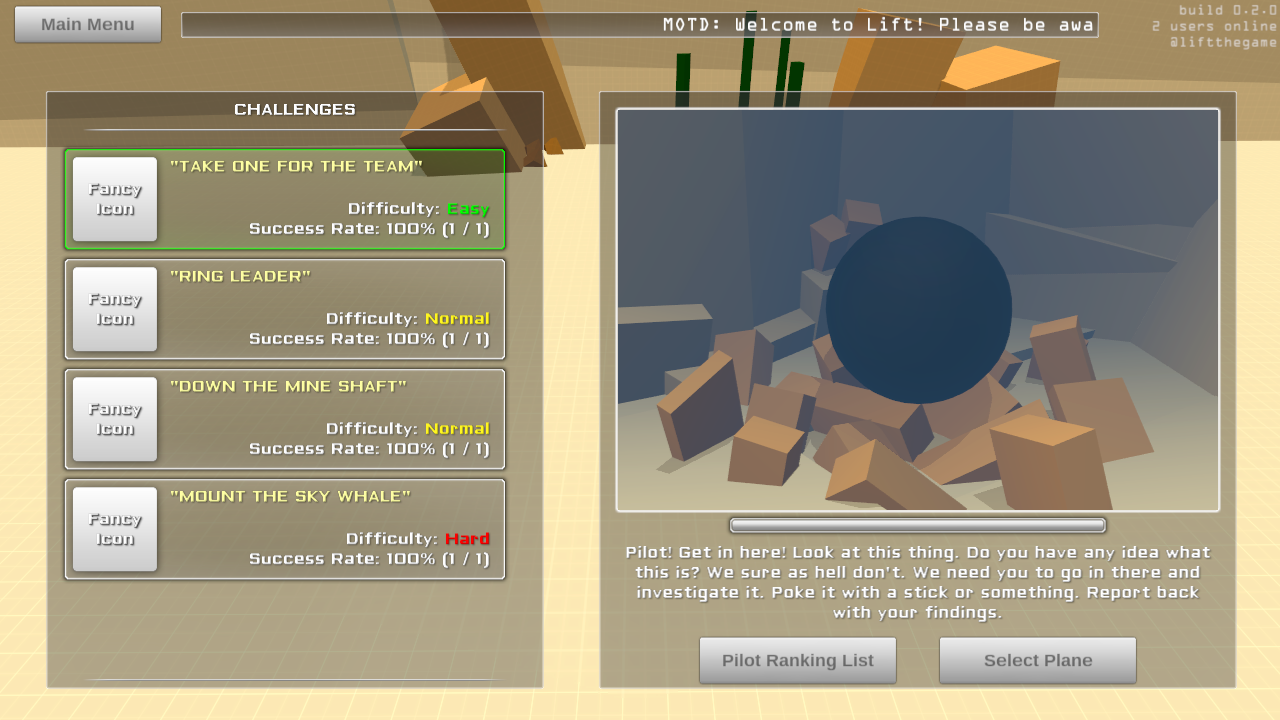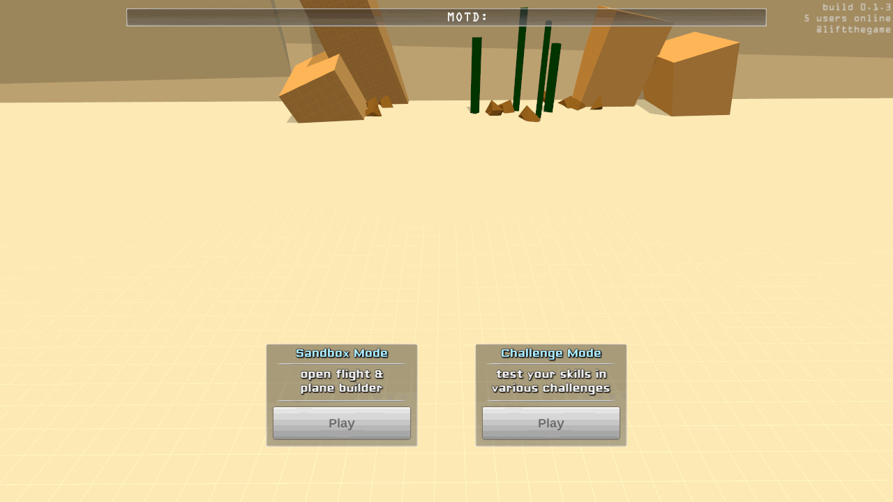 0.2.0 is available now. BrowserWin32LinuxOSXThis wasn't supposed to be ready just yet, but I decided not to sleep in order to make this happen. IndieDB put Lift on their front page featured banner rotation thing just as I was going to go to bed. I didn't want another batch of new people playing the old build, so I made it work. We'll see if I regret this decision tomorrow when everything breaks  Anyway, some cool stuff for 0.2.0. Lots of small bug fixes and user interface improvements. A proper escape menu, better controls menu, etc. The big changes are 4 challenges added (click for big):  and a new sandbox map:  The challenges are where I wanted them to be. They range from easy to hard, although this is with only myself testing so they're probably all hard for someone new  I set up the challenges to track success and failure, not only for each challenge but each plane as well. Hopefully this will help people get them done. I should have probably sorted the planes list by success rate so the best ones are always at the top, but... I didn't. The sandbox map is not exactly how I wanted it, but it is miles ahead of the last build. Some stuff scattered about to play with, or just cruise around the map which is fun too. It's fun to buzz the water, even though it doesn't actually act like water yet. Another thing I added was the ability to comment on each plane. This was mostly due to me wanting to respond to either the bug reports or people asking for help in their notes when they publish their planes. And going back to the drag physics updates, I managed to integrate the first level of improvements but not the more advanced changes. That will come later. Some editor related changes: - drag coefficient is exposed for non wing components. This allows for more control over certain builds, like the enterprise which has such a unique design. - center of gravity is now restricted to the bounds of the object. This is mostly for preparation of the next physics update. Plus it should just be this way anyway to prevent really weird looking physics behavior. - you can now use the arrow keys and throttle to simulate the planes controls in the editor - added plane name input field to the publish menu... too many "New Plane"'s floating about  And a couple other significant changes: - another toggle to the plane selection menu for "this version" or "compatible versions". I put this in because the old version still works, however due to the drag changes they don't necessarily fly like they originally did. Hopefully the old planes being in a different list will be enough to indicate new version and new changes? - planes should now sit nicely on the ground regardless of how they are built in the editor. There's more, but mostly minor stuff. This will probably be the last big update for a while. The editor overhaul is coming next, and I'm still not entirely sure how that is going to go.