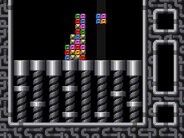 I added in a kind of anti-Tetris mechanic. Filling in the whole bottom row is bad. It will make the bottom row get destroyed, but it will be replaced by an unbreakable screw/piston thing that will rise from the floor. You won't even get score for the row that gets destroyed. I'm hoping this will make the player not only avoid expanding their tower up, but also out. I also fixed a bunch more bugs with colour matching and block placing A screenshot with those screw/piston things. They are taking up half the screen, but I don't think that they will be able to get that high without the player dying in game.
