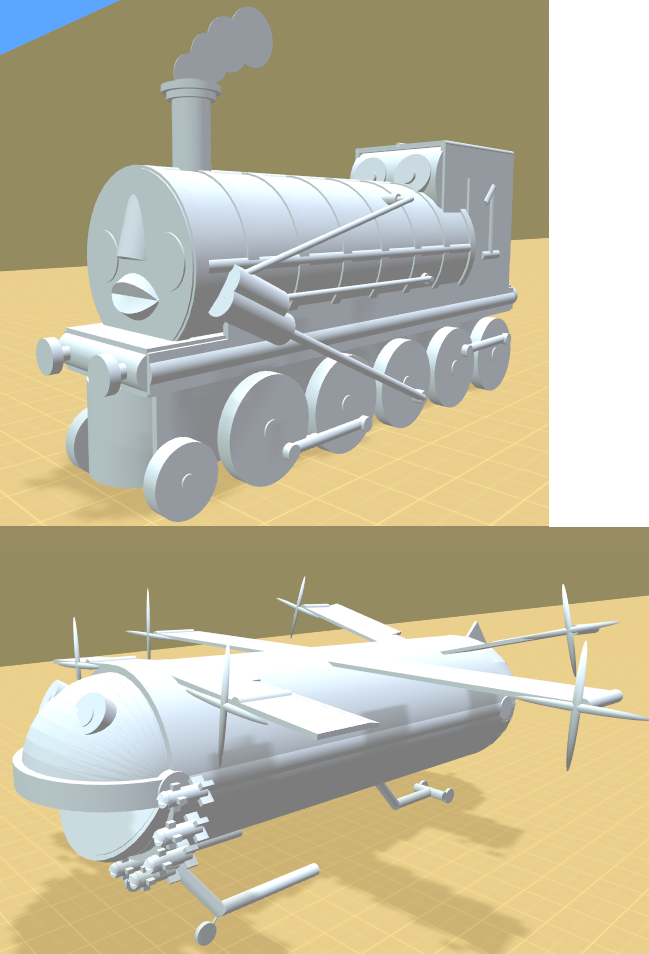 Is it possible this is one of those games that will have an indefinite rolling release? Were you going to add a level editor? If so that makes four big features if you count sandbox, challenges and plane editor. You might want to think about adding spit and polish to those and slapping a price on this thing. I'm not entirely sure where the line is between keeping it free and putting a price on it. This seems like an ideal game for early access or some other alpha funding method, but I just want to make sure there is a little more focus before I think about putting a price on it. Anyway, here are a couple of the newest and craziest designs, both made by Cosmic Grenade.  Those are separate, detachable missiles on the 2nd one. And they both fly, even the train