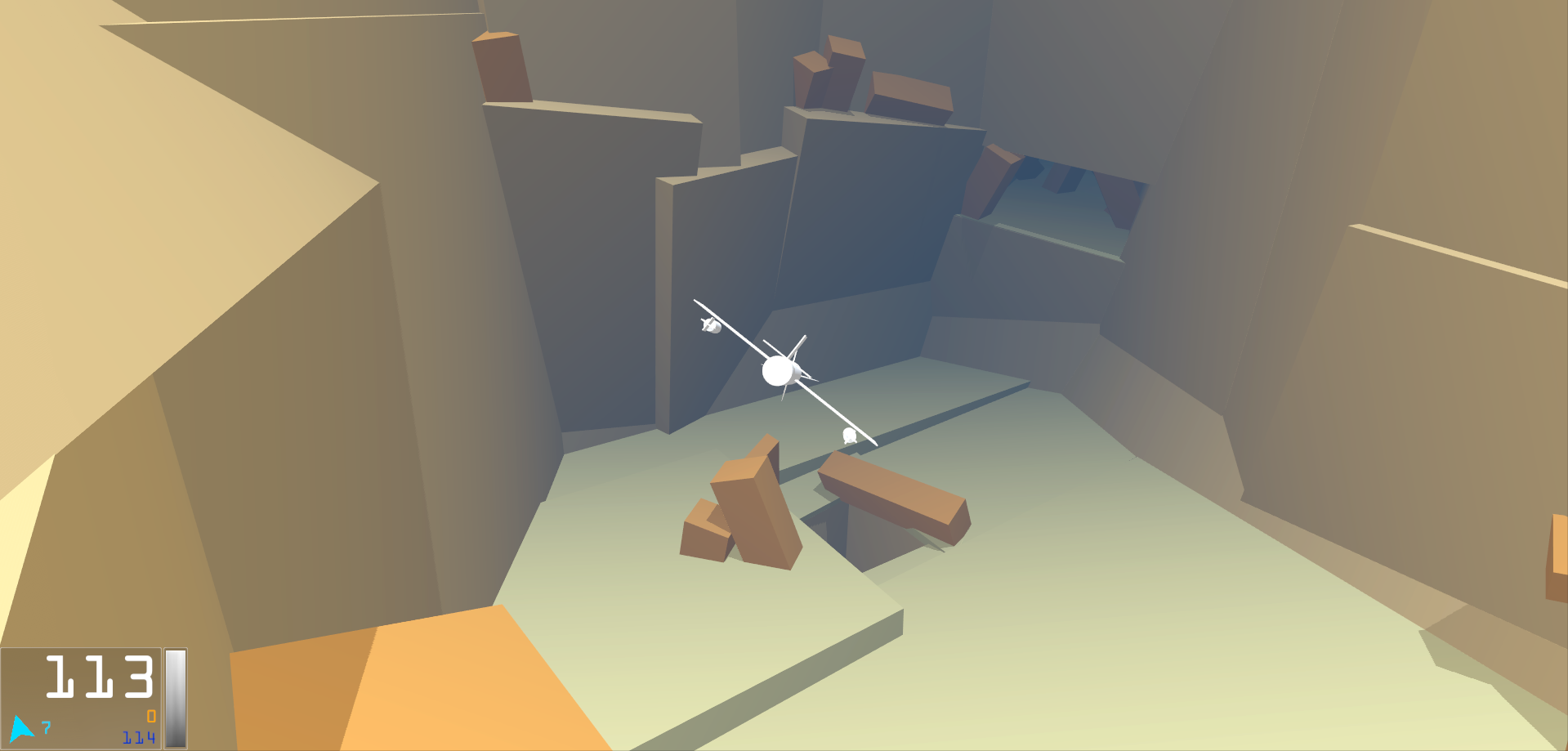 Thanks! I'm not an artist so I would like some style I can actually work with and produce. This style is nice because I can put it together and iterate on it quickly. Yeah especially in that first screenshot, looks really good. Minimalist and stylized without feeling like it's early pre-alpha conceptual graphics (like that first demo area did). I mean that in a good way. Sometimes abstract style just seem cheap and off somehow, but the canyon looks like an interesting location. And the abstract design means you're not chained to realistic environments. You can go as over-the-top and creative as you want, without it feeling extraneous. The planes themselves probably need to be more refined, but the art just works for the world. Definitely want to try and survive flying in that hole.