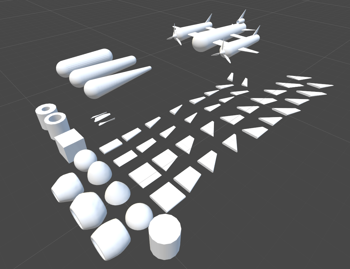 I've been thinking a lot about this as well, but it is kind of complicated. Right now the plane components are built from code using parameters defined in the plane builder. The physics involved are also based on those parameters. So a wing that is 4x2 will look exactly that size and the physics will also be calculated using that size. Same with the other types of components. There is also no restrictions on how components can be placed in relation to the other components. This allows you to literally build whatever you want, however you want it. Unless it is designed properly though, it won't fly. On the flip side is having a collection of prebuilt components that look pretty, but not having the ability to have them be completely user defined. Another trick is having the physics match the visuals in a believable way. Here is an example of some components a friend of mine built after he saw how lame the planes looked  (click for larger view)