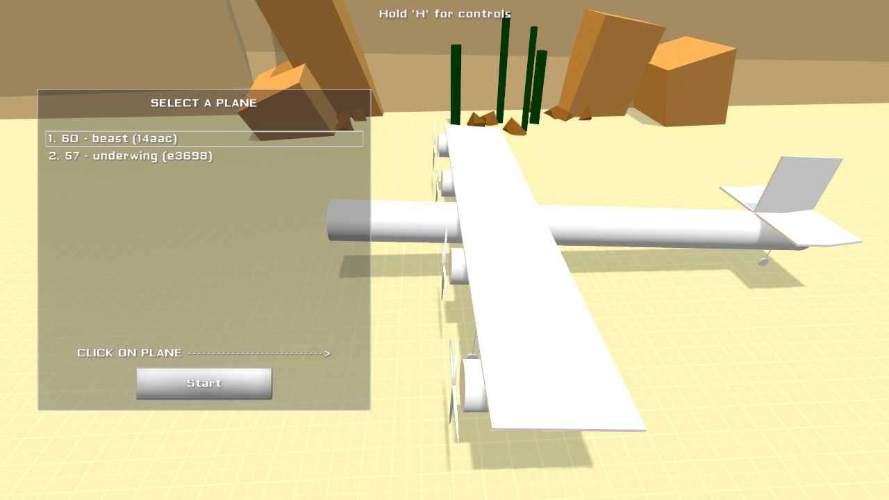 I just uploaded a new build with a bandaid on a problem I've been seeing. Play!The problem seems to be if there is no downforce applied to the tail of the plane by adjusting the pitch during takeoff, the tail will lift off the ground and then the plane drifts to one direction and the result is likely a crash. Unless you see it coming and can adjust the pitch appropriately, but that isn't something a new player will know to do. So, this "bandaid" just auto sets the elevator to a certain angle right away so if you don't touch anything the plane will take off by itself. I'm not sure if this is actually a real world problem that can happen or just an issue with the physics simulation. It is kind of a nice feature in some ways, but really annoying for a new player if they don't know what to do or what is happening. I just tried it, and saw the issue. I have some rudder pedals plugged in to the computer, and unity is seeing them as a joystick. I kept flipping to one side, and then realized that my left foot was controlling the ailerons; if I kept it tilted forwards, they would be level. Then I still kept flipping over, until I realized that my right foot was controlling the elevator, and moving it from your setting. I don't see why you should push to one side like that. Maybe it's an issue with the wheels?