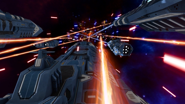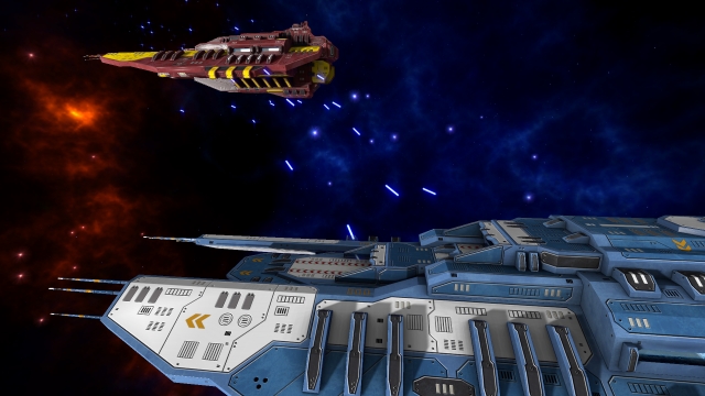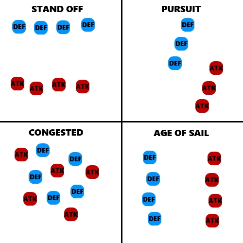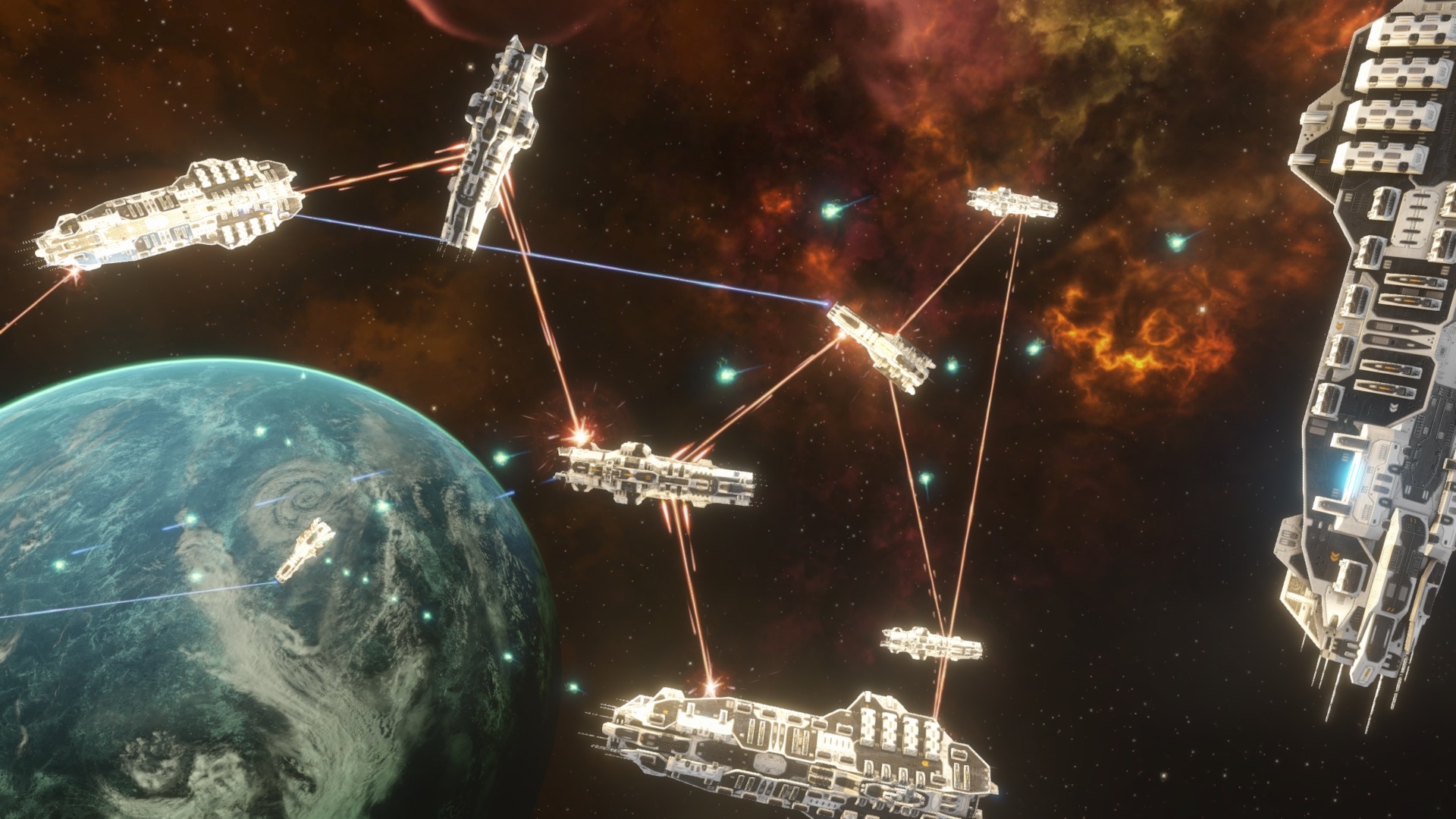 Beams are in. Can you spot them? 8D  (click for 1080p) Next up is actually being able to play a battle. I'm not really sure how I want the ships to stand off. Here's the general setups I've noticed after watching hours of sci-fi footage on YouTube:  My gut says congested would be the most visually pleasing but might be a real nightmare for gameplay. I'm also not entirely sure how the battle would start in that state -- though it could be pretty cool to have to find your bearings after your fleet warps in. My second favourite would be pursuit. What do you guys think? * * * Looking good! As for you battle system, have a look at flotilla. I handles movement in a similar way, teams get to give orders during pause and then carry out in realtime.