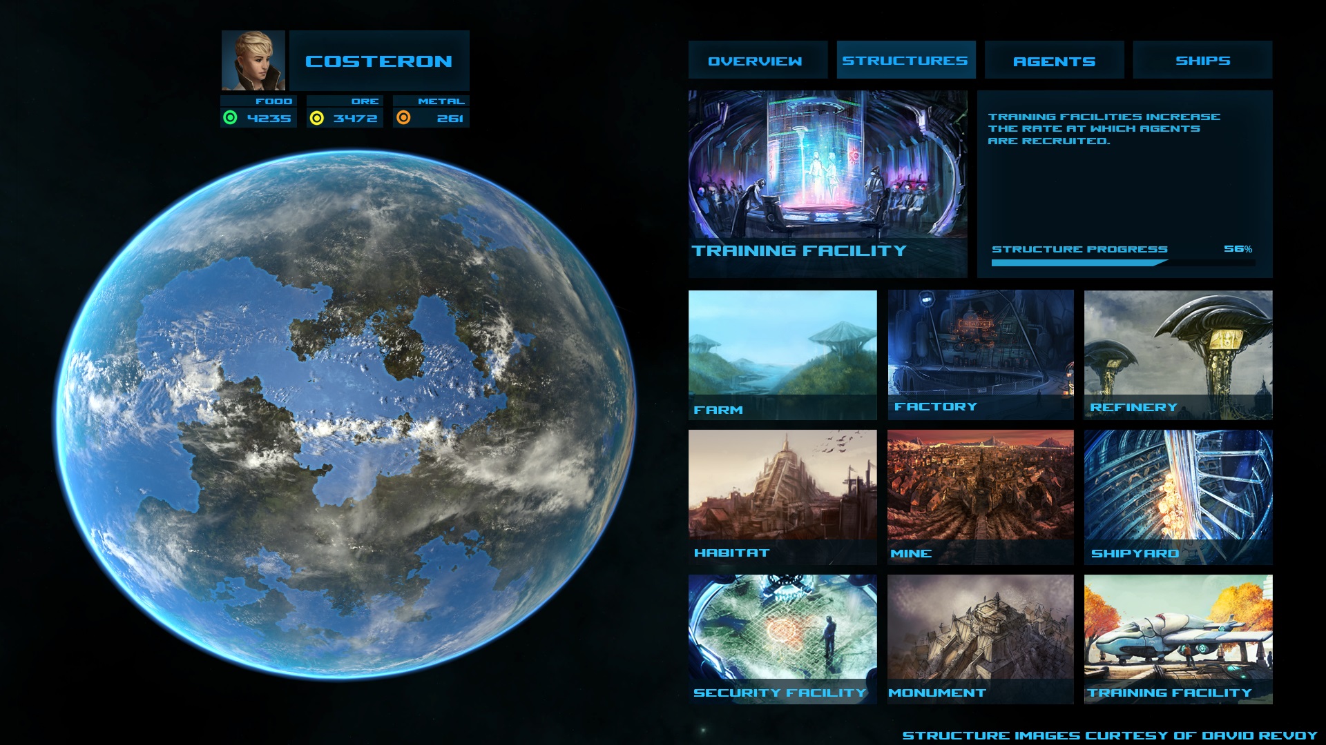 Here's a mockup for the planet UI. Feedback very much appreciated here:  Structure portraits courtesy of David Revoy from the Wikimedia Commons.