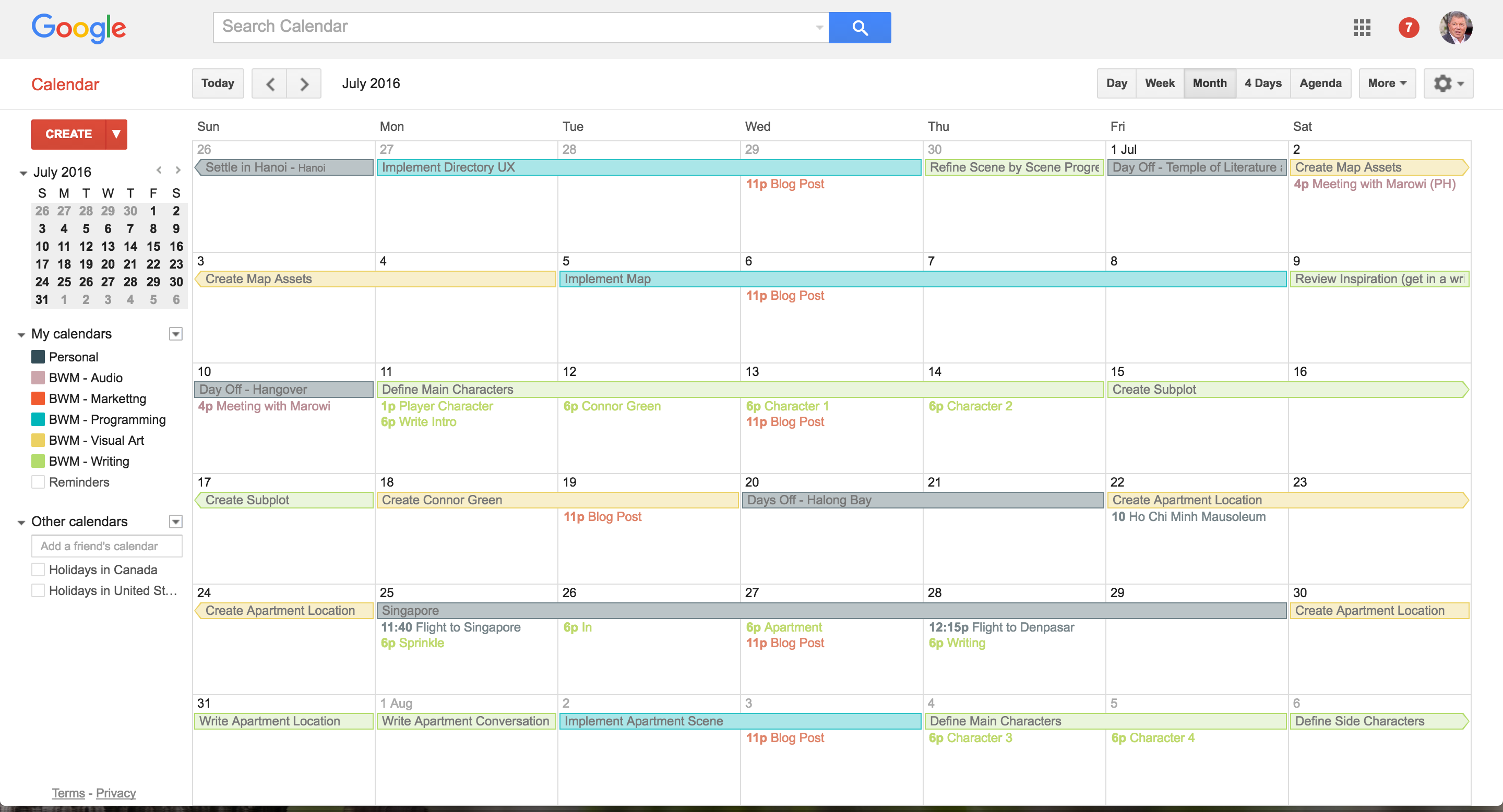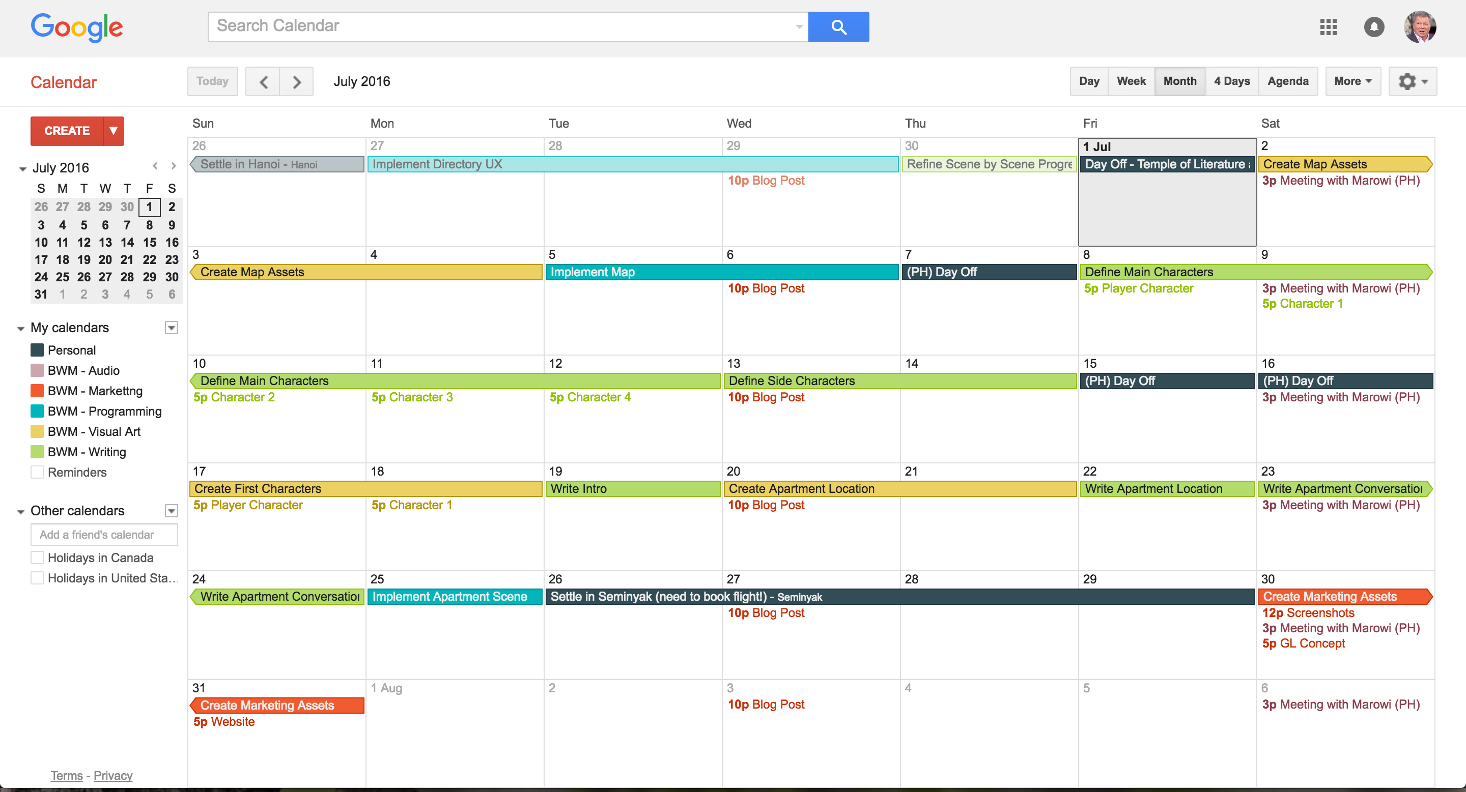 Google Calendar lets you to make separate calendars with different colours. I create a new calendar for each "department" of my game. On top of my personal calendar, I have: Audio, Marketing, Programming, Visual Art, and Writing for the game. Here was my plan for July (you can see this screenshot was taken on the 1st of July):
