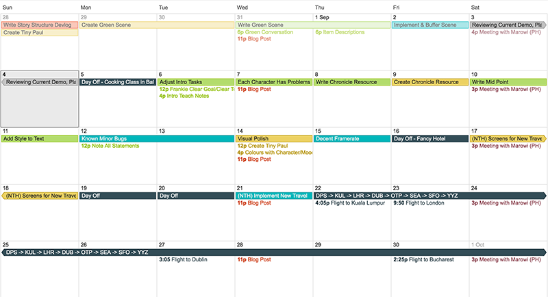 - The month view clearly displays what I'm working on that month, so it's easy to spot if I'm not working on a particular part of the game for a stretch of time, and then decide if I'm okay with that. This coloured display is usually the missing element of other free planning software