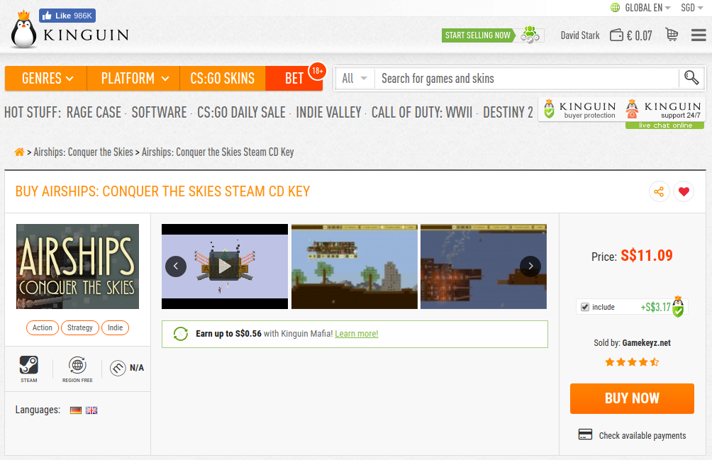 Over the past few weeks, I have noticed an uptick in the number of Steam key activations for Airships, without a corresponding increase in sales through itch.io or Humble Store. I had a look and found that Kinguin did indeed have keys for my game in stock. I don’t do large-scale giveaways, I don’t do bundles, I don’t do big sales, so where were those keys coming from? Of course, a regular buyer might decide that the download link they got was good enough for them, and that they could sell on the key, but why was this happening so much more now?